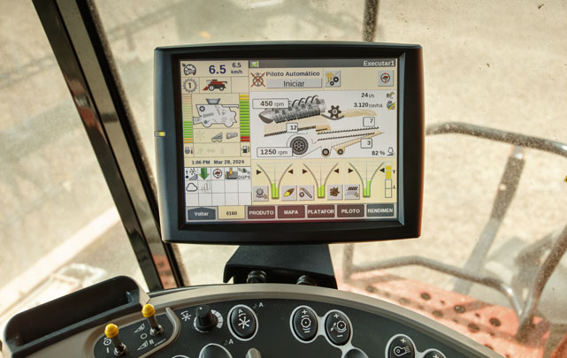O Sistema Automation controla: Velocidade de deslocamento; Rotação rotor; Rotação ventilador; Carga do motor; Carga retrilha; Nível de perdas; Diversos sensores e câmera de grãos.